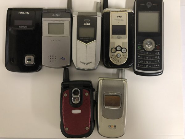 (請求者が使用公開の証拠としようとして提出した舊型攜帯電話7機種。左から右、上から下へ順に、フィリップス9@9r、夏新A8、波導V08、夏新M66、モトローラW161、パナソニックX77、サムスンSGH-S508)