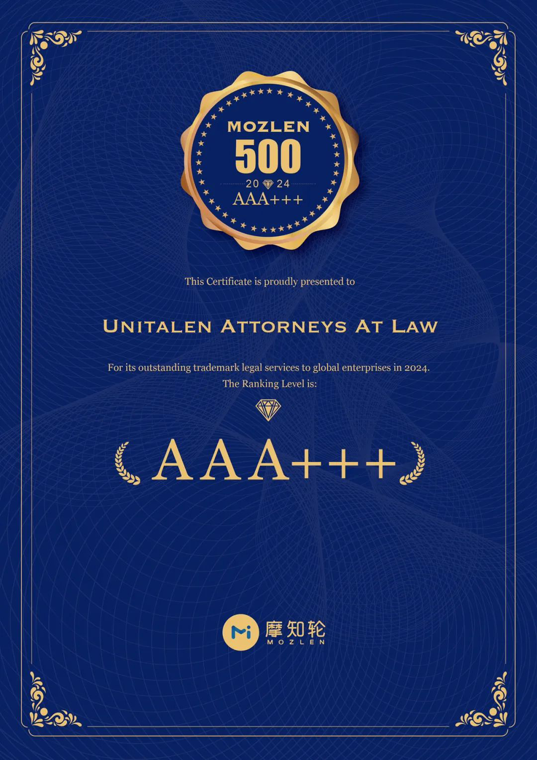 | Unitalen Selected into "MOZLEN 500" Top 10 of China Professional Foreign-related Trademark Agencies in 2024 with Ranking Level of "AAA+++" |
