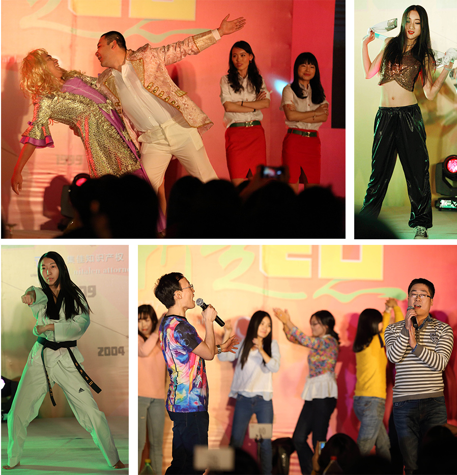 在經(jīng)久不息的掌聲中,集佳20年年會會議部分圓滿結(jié)束,一曲熱情洋溢的《奔跑》活力開場,十幾位青年才俊“歌神”跳上舞臺,熟悉的旋律,高亢的領(lǐng)唱,歌聲很快感染了全場。《集佳,對你愛不完》、《小雞舞》、《小蘋果》、《動感現(xiàn)代舞》紛紛精彩上演,《歌舞串燒》更有國外客戶友情出演,還有穿越大戲《步步蛇精》,匪夷所思的故事情節(jié)吸引了眾人的眼球,《跆拳道舞》由已獲跆拳道黑帶的流程部同事領(lǐng)舞。集佳合伙人也全力打造三句半《四大才子夸集佳》,作為獻(xiàn)給集佳所有員工的一份禮物。