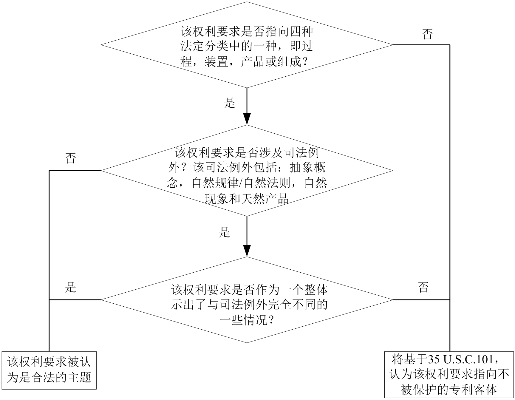 在審查過(guò)程中審查員通過(guò)三個(gè)步驟來(lái)判斷,一個(gè)權(quán)利要求是否屬于可專(zhuān)利的保護(hù)客體。如果最終的判斷結(jié)果是“否”,則這個(gè)權(quán)利要求初步認(rèn)為是不合格的,其將被拒絕由于其不屬于可專(zhuān)利的保護(hù)客體。具體的判斷流程如下圖所示: