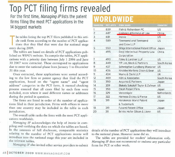 根據(jù)全球權(quán)威知識產(chǎn)權(quán)刊物Managing Intellectual Property (MIP)2009年10月期公布的一份數(shù)據(jù)顯示,全球PCT申請統(tǒng)計(jì)中,在申請日(優(yōu)先權(quán)日)介于2006年7月1日至2007年6月30日之間,30個(gè)月的絕限落在2009年1月至2009年12月間的已經(jīng)公開的PCT申請中,集佳知識產(chǎn)權(quán)代理有限公司以687件申請?jiān)谌虼頇C(jī)構(gòu)排名中僅次于一家美國事務(wù)所而位列第二,也是中國唯一一家躋身全球前五名的知識產(chǎn)權(quán)服務(wù)機(jī)構(gòu)。