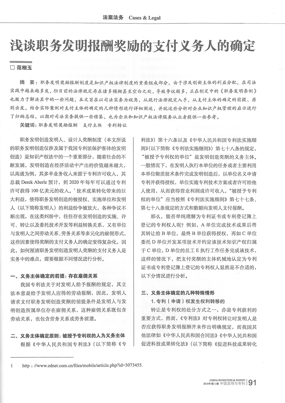 集佳文章《淺談職務發明報酬獎勵的支付義務人的確定》在《中國發明與專利》發表