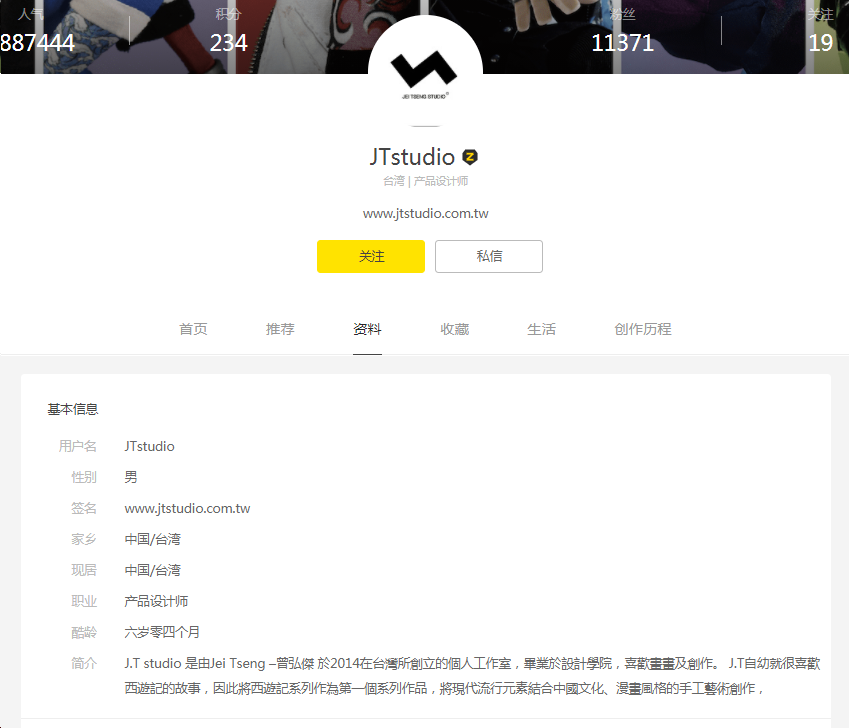 異議人站酷ZCOOL網(wǎng)站的個(gè)人主頁(yè)(https://www.zcool.com.cn/u/2732656/profile#tab_anchor)顯示,J.T studio是由異議人曾弘杰(英文名Jei Tseng)2014年在中國(guó)臺(tái)灣所創(chuàng)立的個(gè)人工作室,曾弘杰畢業(yè)于設(shè)計(jì)學(xué)院,喜歡畫畫及創(chuàng)作,自幼就很喜歡西游記的故事,因此將西游記系列作為第一個(gè)系列作品,將現(xiàn)代流行元素結(jié)合中國(guó)文化、漫畫風(fēng)格的手工藝術(shù)創(chuàng)作。異議人在站酷ZCOOL網(wǎng)站擁有11371位粉絲,人氣值高達(dá)1887444。
