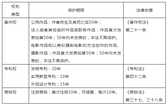 對于國家法律賦權的著作權、專利權、商標權等而言,其權利的期限都有明確的法律規定,具體可以參照下表。