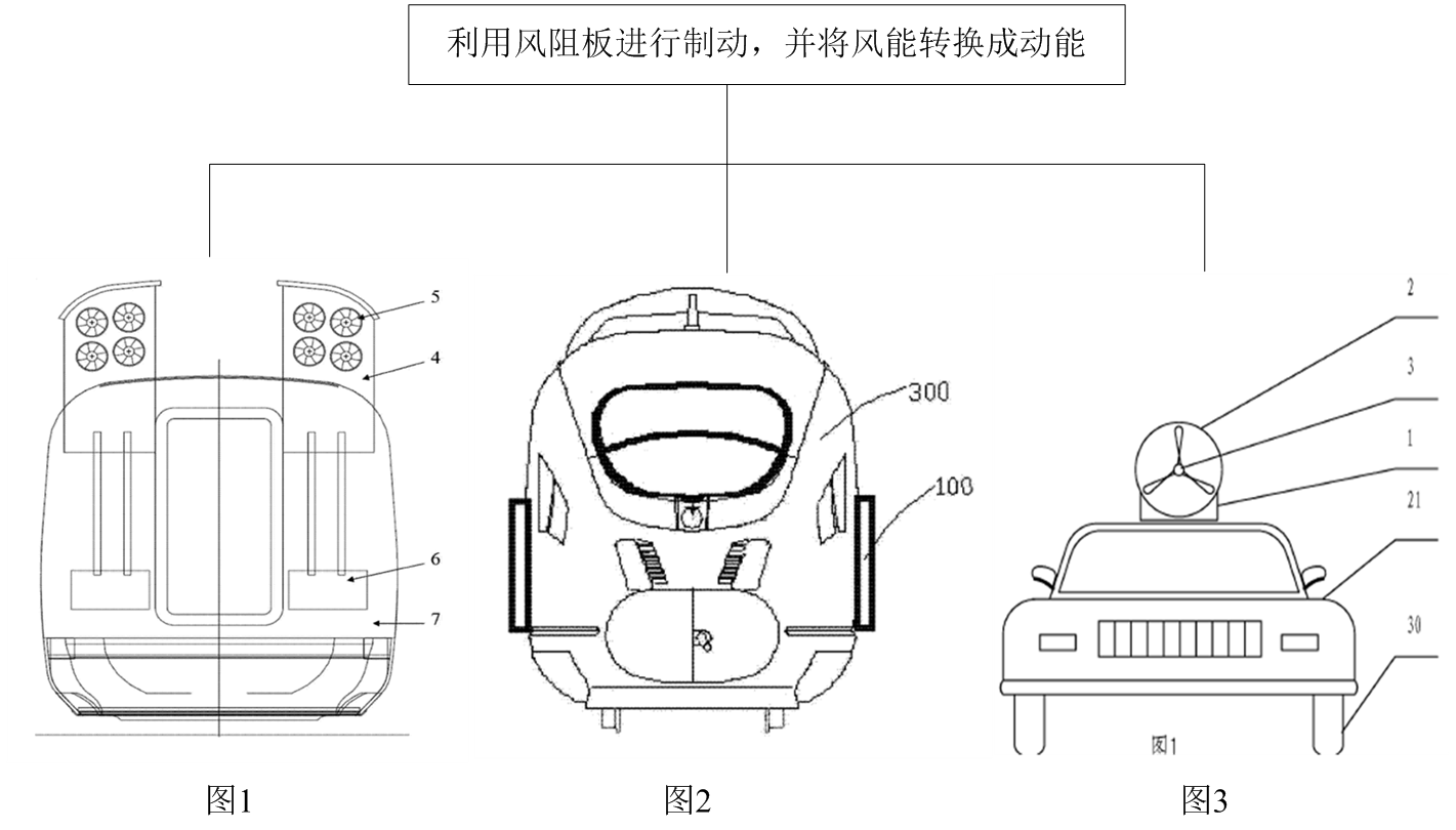 構(gòu)件檢索式(TI=(風(fēng)阻制動(dòng))) AND (IPC=((B61 OR B60)))在DOCDB、CNIPR就檢索到9件與該發(fā)明構(gòu)思相同的專利,但是具體的實(shí)現(xiàn)方式不同,例如專利CN202944357U保護(hù)的技術(shù)方案如圖2所示,具體的“風(fēng)阻制動(dòng)裝置,包括風(fēng)阻制動(dòng)板和驅(qū)動(dòng)機(jī)構(gòu),驅(qū)動(dòng)機(jī)構(gòu)包括驅(qū)動(dòng)桿,驅(qū)動(dòng)桿鉸接于風(fēng)阻制動(dòng)板,風(fēng)阻制動(dòng)板的一端交接于固定座,并由驅(qū)動(dòng)桿驅(qū)動(dòng)而可繞固定座轉(zhuǎn)動(dòng)”。專利WO2012003631A1權(quán)利要求1保護(hù)的技術(shù)方案如圖3所示,具體的“包括車體、安裝在車體上的蓄電池、和右蓄電池提供電能的電動(dòng)裝置、與蓄電池電連接的涵道風(fēng)力發(fā)電裝置,隨車輛的快速行駛產(chǎn)生合流風(fēng)進(jìn)行風(fēng)力發(fā)電,并將電能儲(chǔ)存在蓄電池內(nèi)”。