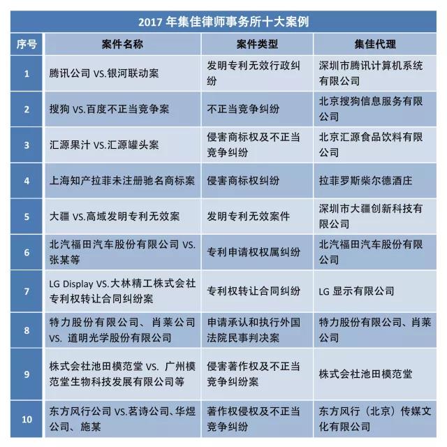 2017年集佳律師事務(wù)所十大案例