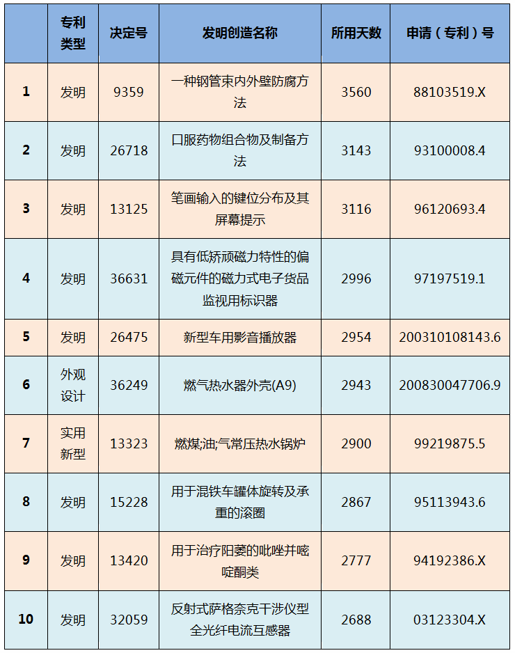 另外,上述總體平均用時(shí)與一般經(jīng)驗(yàn)相比明顯過(guò)長(zhǎng)。對(duì)此,筆者統(tǒng)計(jì)了用時(shí)最長(zhǎng)的決定,初步可以判斷用時(shí)較長(zhǎng)(例如超過(guò)1年)的案件均涉及一次或者多次行政訴訟,因此耗時(shí)較長(zhǎng)。其中前10個(gè)耗時(shí)最長(zhǎng)的決定列表如下,以供參考: