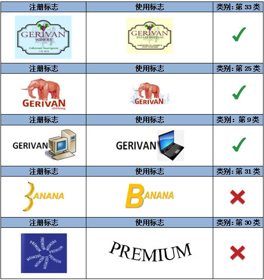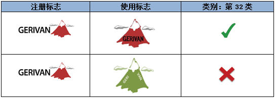 如上述示例,注冊商標指定在第32類礦泉水商品上,相較而言,圖形對指定商品具有一定暗示性,而顯著性較弱。因此,文字部分“GERIVAN”為該注冊商標的主要顯著部分。第一組中的使用標志僅是對圖形和文字的位置進行了調整,不影響文字部分的顯著性。而第二組的使用標志對文字進行了拆分,形成了新的商業印象,故視為實質變更。
