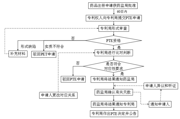 1)PTE申請人(專利權人)在收到藥監局上市批準的規定時限內(例如60日)向專利局提交PTE申請;