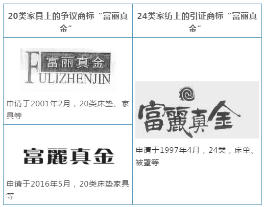 隨后,富麗真金家紡先后對富麗真金家具兩枚注冊商標,提起無效宣告。
