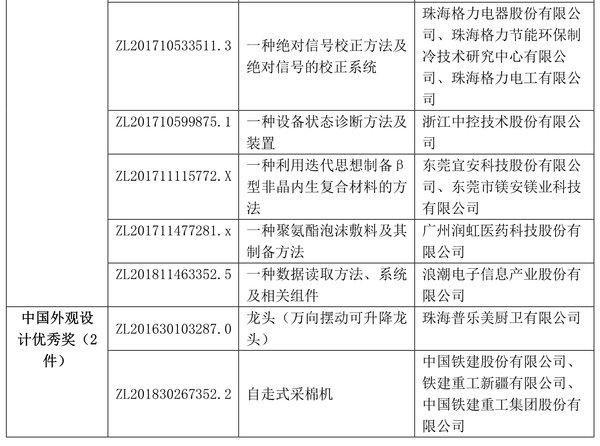 6月25日,國家知識產權局發布了第二十二屆中國專利獎授獎決定,為30項發明、實用新型專利授予中國專利金獎,10項外觀設計專利授予中國外觀設計金獎,60項發明、實用新型專利中國專利銀獎,15項外觀設計專利中國外觀設計銀獎,825項發明、實用新型專利中國專利優秀獎,56項外觀設計專利中國外觀設計優秀獎。