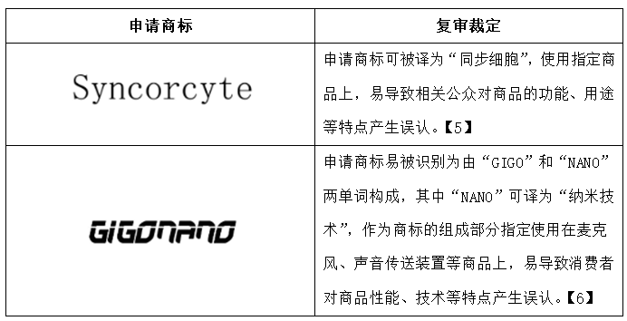 如“Syncorcyte”,其中“sync”為英文“synchronization(意為同時,同步)”的常用縮寫,“cyte”可以翻譯為“細胞”,因此該商標可以模糊的解釋為“同步細胞”,雖然“sync”和“cyte”都不是簡易英文單詞,一般消費者難以識別,但使用在第5類醫藥類商品上,審查員從嚴把握,經復審審理最終判定存在產生誤認的可能。
