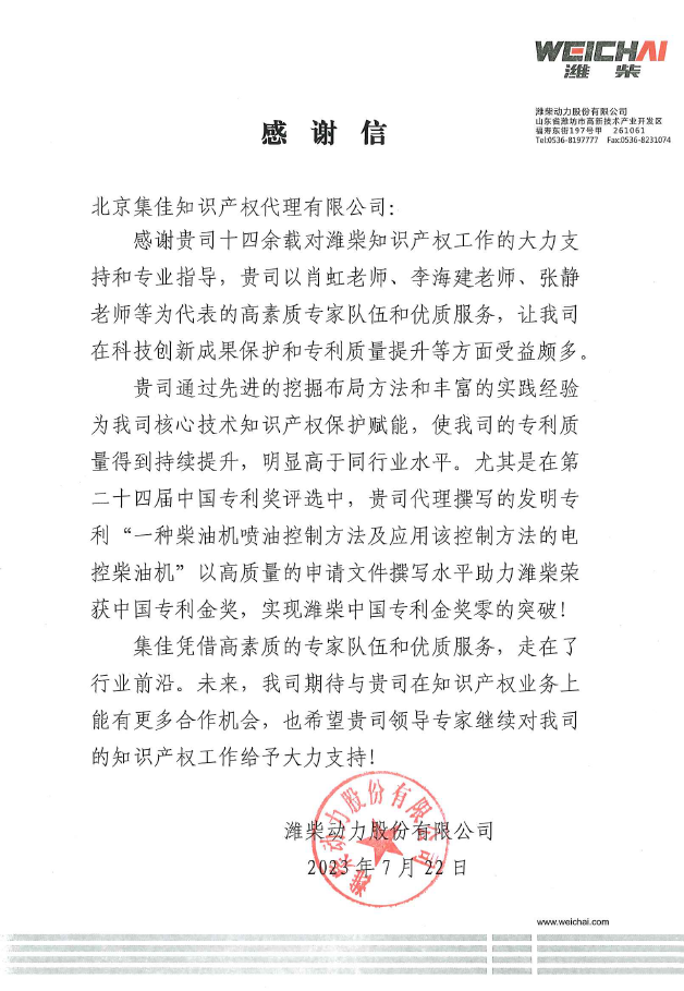 Assisted Customer Weichai Power in Winning "China Patent Gold Award", Received a Letter of Gratitude from the Customer