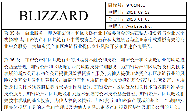 此次異議爭議源于Ava Labs向美國專利商標局申請注冊“BLIZZARD”商標,申請覆蓋與區塊鏈相關的第35類商業服務和第36類金融服務。經初步審定,商標公告信息如下: