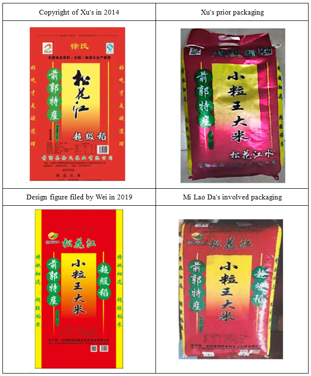 Founded in 2012, Xu's Rice Company is a company engaged in the production and sale of rice in Qianguo County, Jilin Province. In September 2021, Xu's Rice Company received a notice from the Changchun Intermediate People's Court in which Wei, the patentee of the design, sued Xu's Rice Company for patent infringement. Wei then withdrew the lawsuit in October 2021. On July 7, 2022, Wei again filed a lawsuit against Xu's Rice Company for design patent infringement in Songyuan Intermediate People's Court (hereinafter referred to as the "Case No. 28"). In this regard, Xu's Rice Company entrusted the attorneys of Beijing Unitalen Law Office to respond to the lawsuit.
