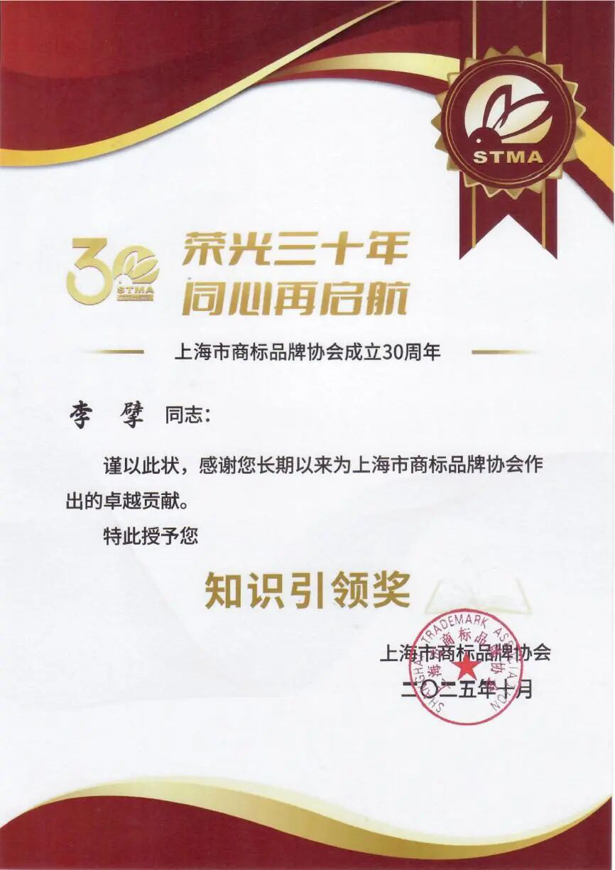 2025年10月16日,“榮光三十年·同心再啟航”上海市商標(biāo)品牌協(xié)會成立30周年慶典在上海隆重開幕,會上表彰了對商標(biāo)品牌領(lǐng)域作出突出貢獻的單位及個人,表彰了2024-2025年度典型商標(biāo)代理案例、典型商標(biāo)代理案例提名。
