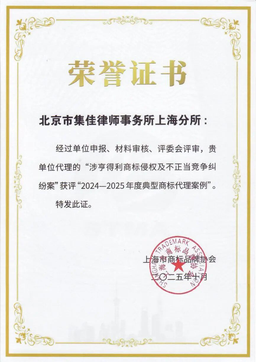 集佳上海分所榮獲“服務(wù)誠信獎”“知識引領(lǐng)獎”、代理案件榮獲“2024-2025年度典型商標(biāo)代理案例”等多項榮譽