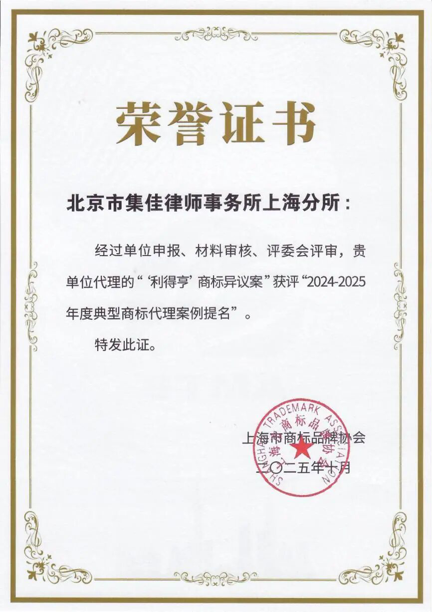 集佳上海分所辦理的“‘利得亨’商標(biāo)異議案”獲評“2024-2025年度典型商標(biāo)代理案例提名”